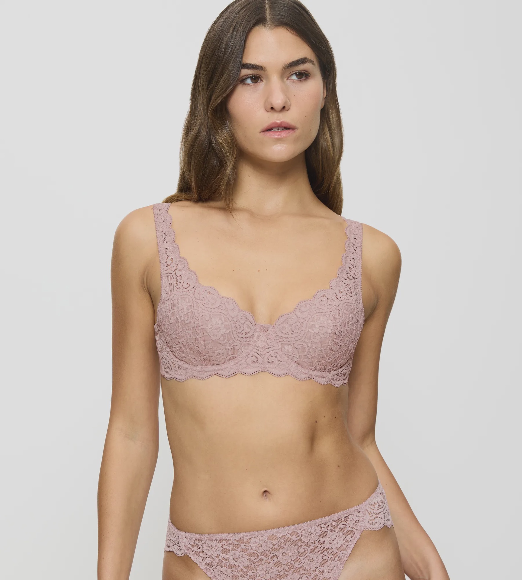 Amourette is made up of Premium fabrics. for a soft touch and sophisticated look. Lace trims and sateen details. to enrich the beloved Triumph styles. • Balconette design with wing in soft & plain microfibre fabric