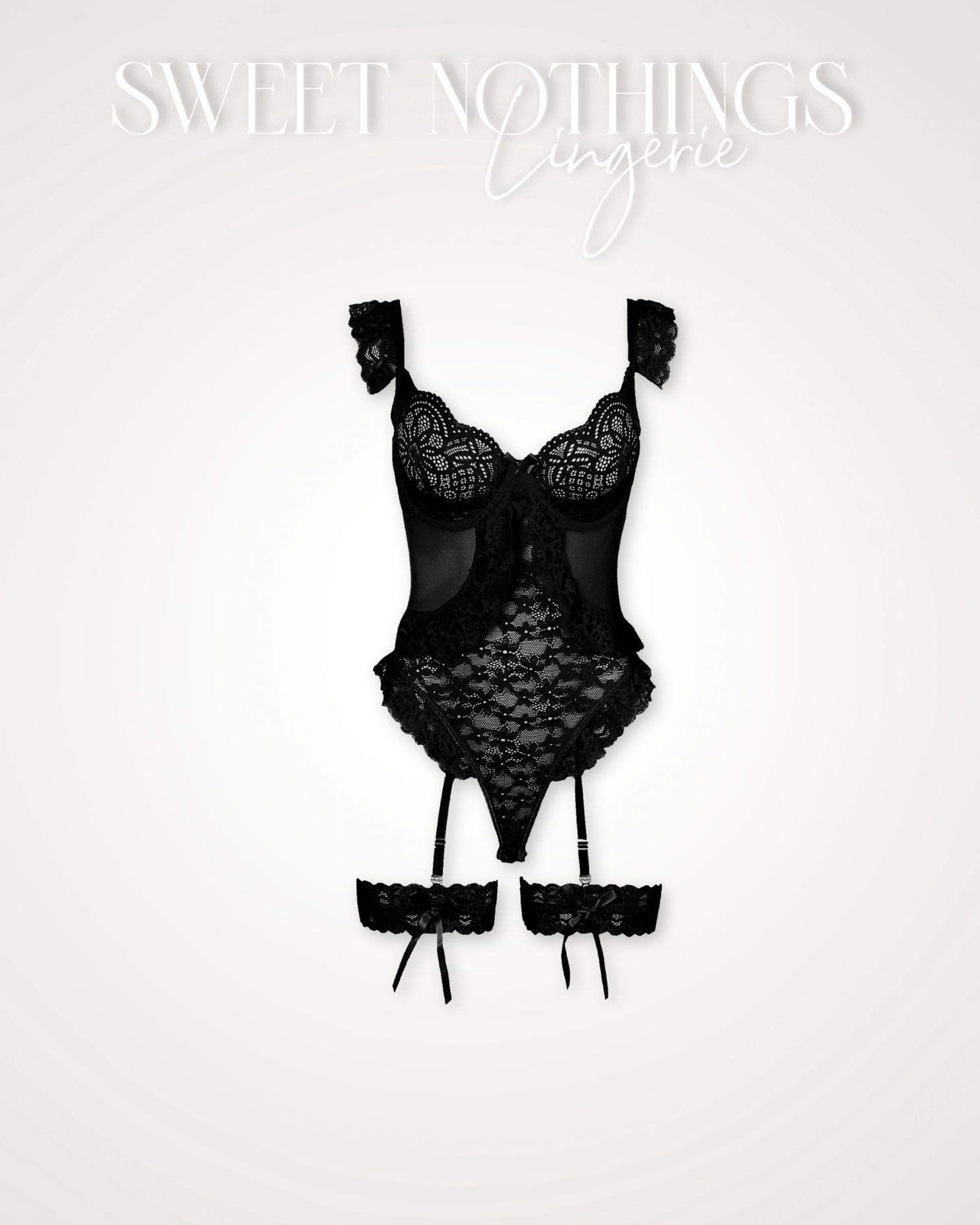This is what irresistible looks like. Sheer mesh, scalloped lace, teasing cutouts, and curve-hugging detail all come together in one jaw-dropping bodysuit. With flirty ruffles, a plunging neckline, and garter straps that beg to be shown off, this set was made to make a statement—and to be remembered.
