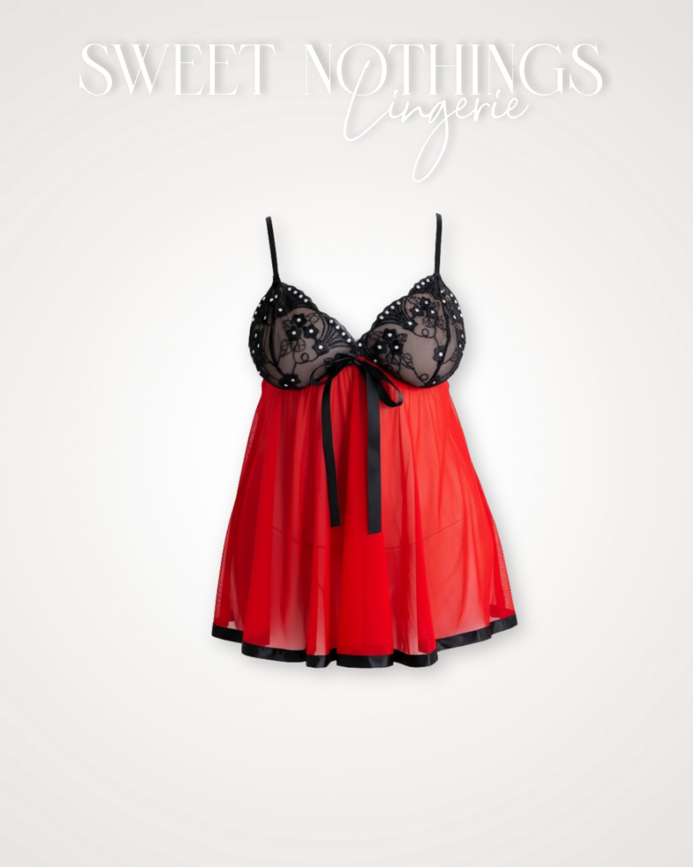 Romantic, flirty, and impossible to ignore — the Azure Babydoll is a showstopper in sheer red mesh and delicate black lace. The soft, flowy skirt drapes beautifully over the body, while the embroidered floral cups add just the right touch of allure. Finished with a satin bow and adjustable straps for the perfect fit, it’s made for nights that call for something unforgettable.