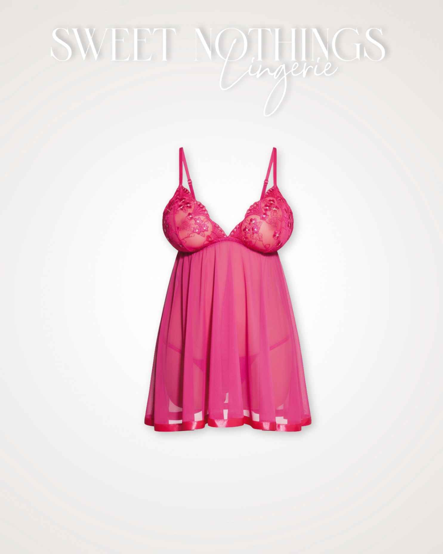 Sweet, playful, and irresistibly feminine — the Hot Pink Azure Babydoll is the perfect mix of fun and sexy. Crafted in soft sheer pink mesh with delicate sequined floral lace cups, it flows effortlessly over curves for a dreamy, flattering fit. Finished with a satin bow and adjustable straps, it’s designed to make you feel as beautiful as you look.