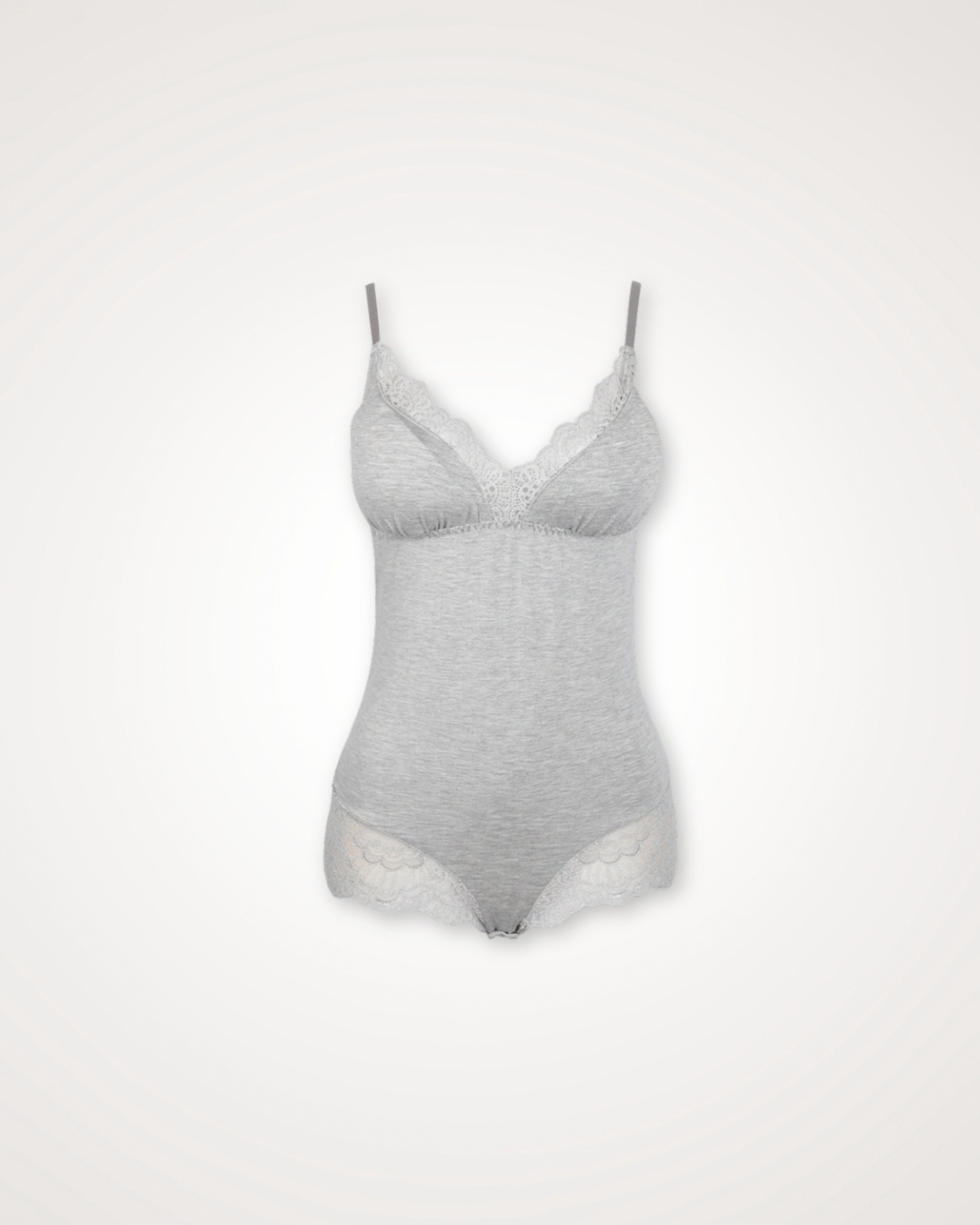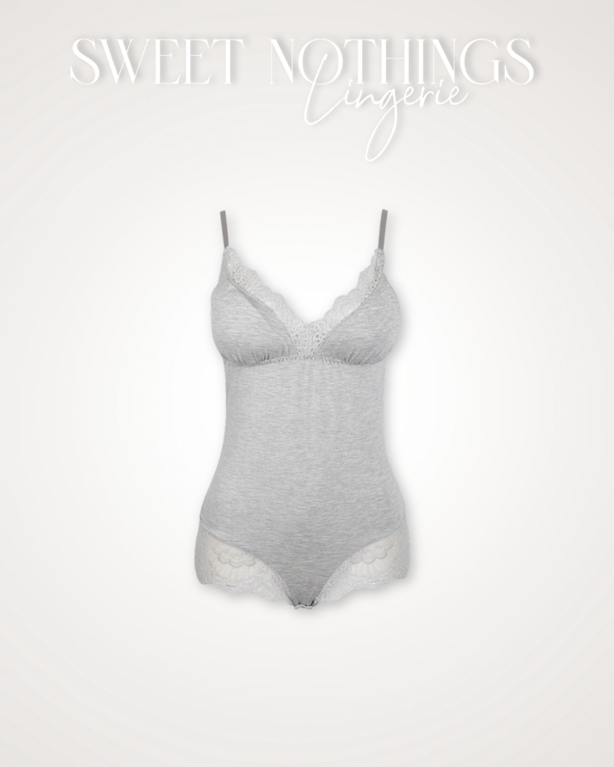 Slip into softness with this grey modal bodysuit — made from buttery smooth fabric that feels as good as it looks. Designed with lightly padded cups for gentle support, lace trim for a touch of femininity, and a convenient snap crotch closure. The ultimate mix of comfort, stretch, and understated sexy.