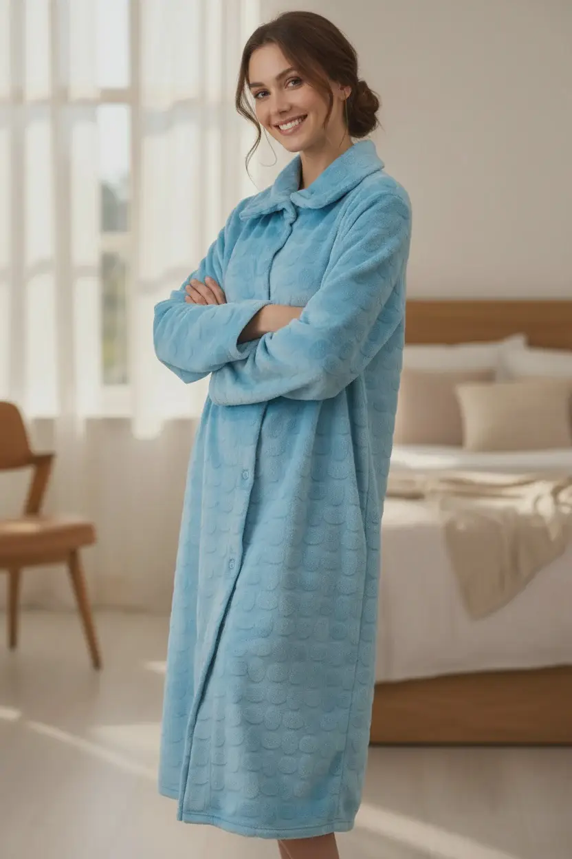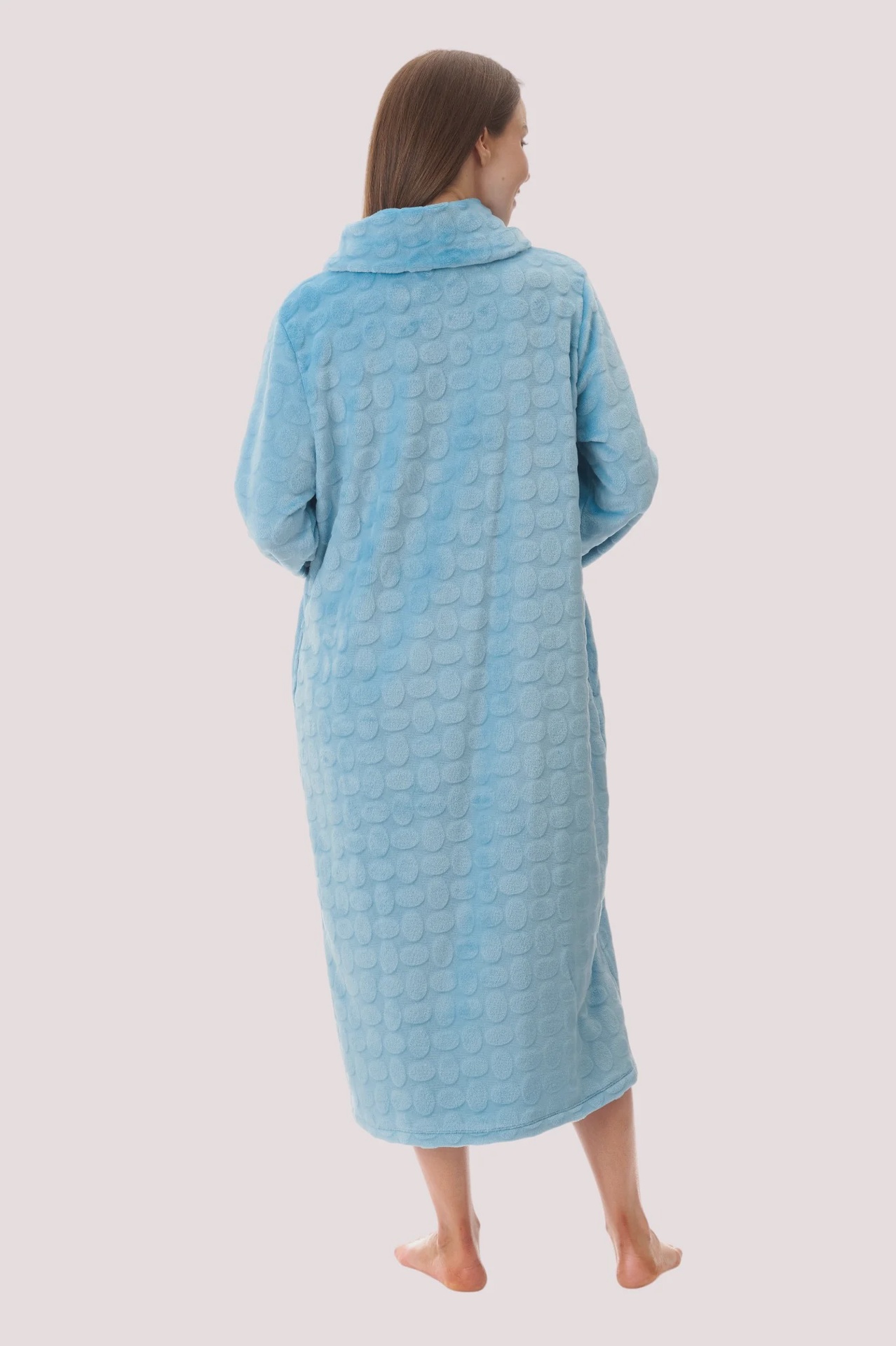 Mid length gown with collar and button front opening. The striking colourway in this luxury fleece is finished with an embossed textured pattern for pure…