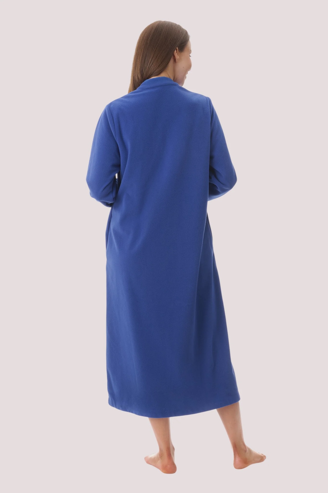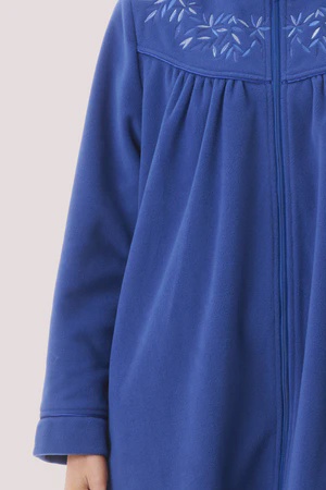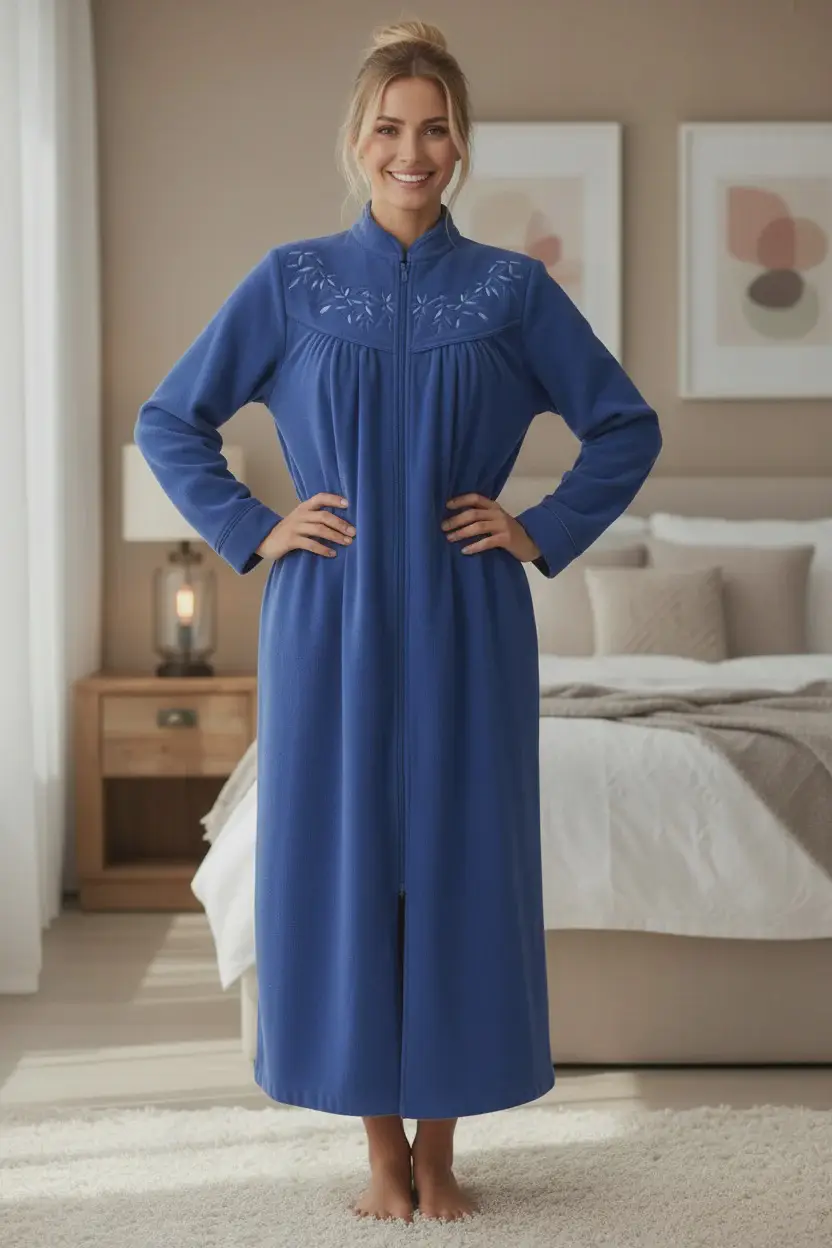 Mid length gown with stand collar and zip front opening. This warm and cosy gown has a shaped yoke, collar and cuffs with satin piping. Soft gathering from the yoke seam. Side pockets. Elegant embroidery in complementary colours on the yoke.