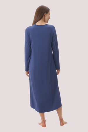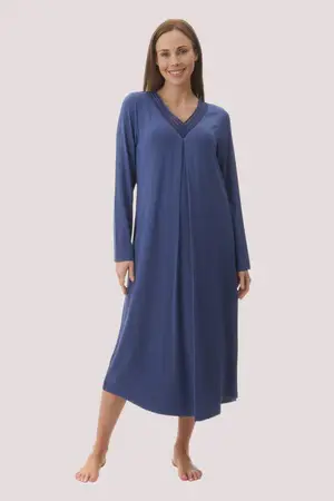 Experience the ultimate in sleep luxury with our Mid length knit nightie in Navy. Crafted from Modal knit this nightie is beautifully soft and comfortable. Featuring elegant satin and mesh detailing on the “”V”” neckline, this nightie is the epitome of comfort and luxury.