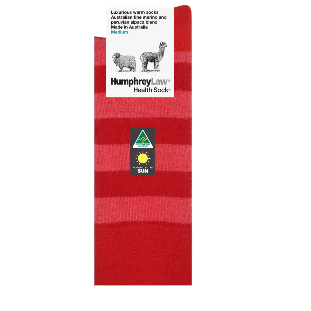 This luxurious and warm sock is a blend of two natural yarns – fine merino wool and baby alpaca. The 19 micron Australian merino fleece wool is sourced from graziers in Southern NSW. The baby Alpaca is sourced from Peru and is soft, supple and smooth containing microscopic air pockets which are perfect for retaining feet warmth. This sock is not recommended for high abrasion use such as in work boots. A Health Sock® with no tight elastic top.