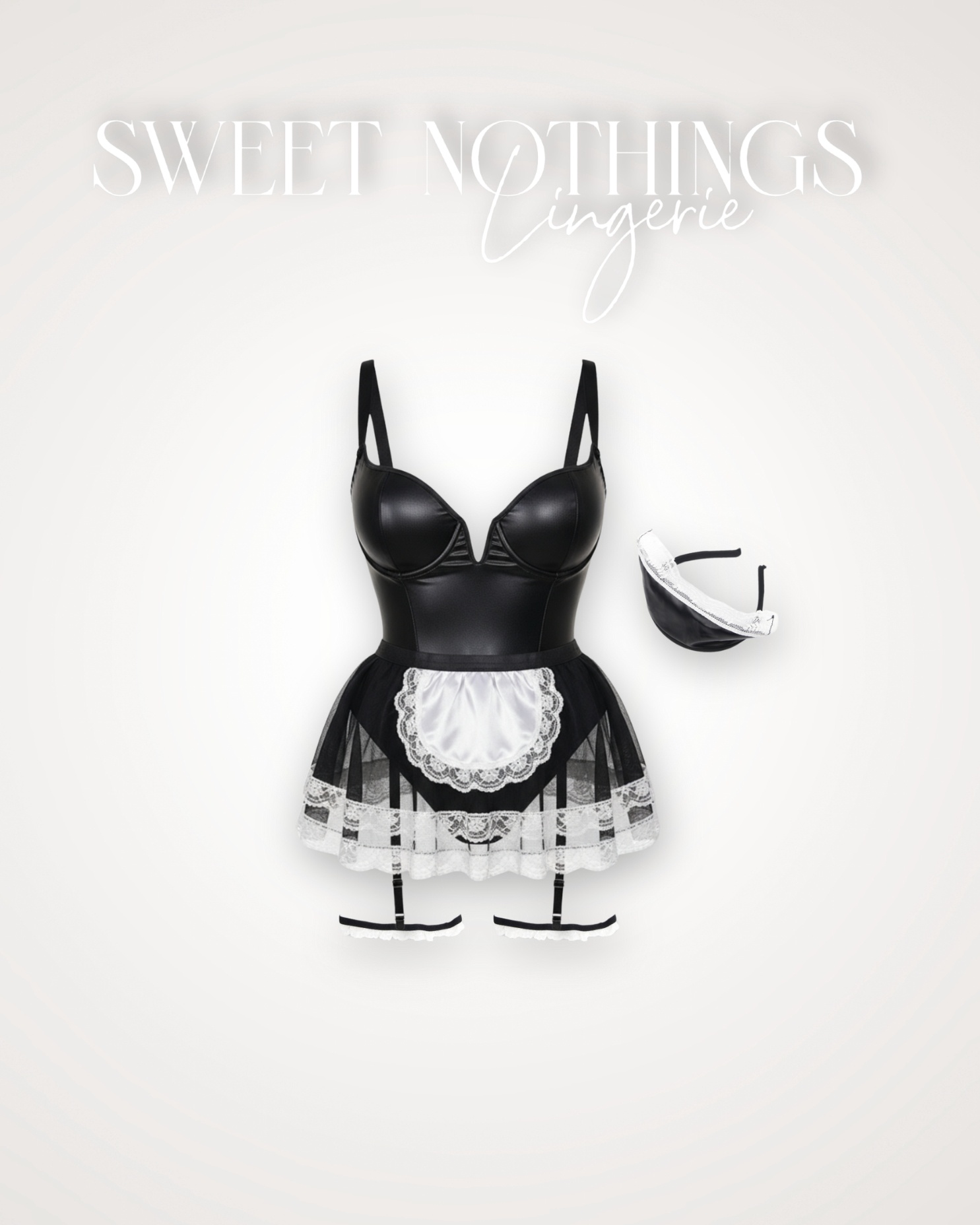 Playfully provocative, this classic maid costume brings a modern leather flair. This set features a sleek black bodysuit with connecting lace garters, finished with a plunging neckline that flatters the figure. Accented with a sheer black skirt trimmed in delicate white lace and a charming satin apron, this set is completed with lace garters and a matching headpiece. Perfect for adding a flirty, fun twist to your dress-up moments.