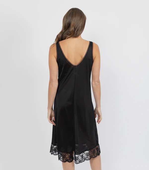 V-neck, Built-up lace shoulders straps, Lace trim to hem, Length 105cm, Dull Anti-static Tricot