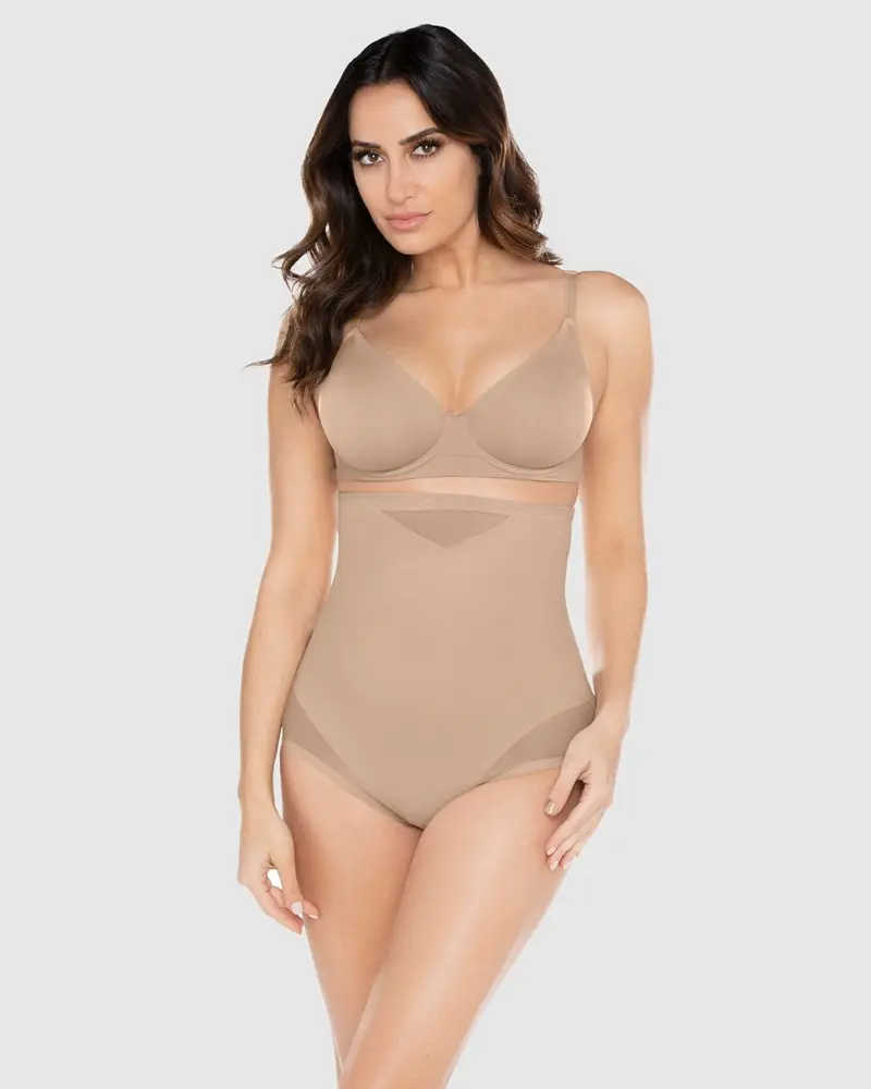 This hi-waist brief from MiracleSuit features sexy, sheer paneling which allows the garment to adjust to your body and create a perfect fit. The double panels provide extra firm control and shaping, but maintain a smooth look under your clothes. Choose it to shape your midriff, and slim your tummy & hips.