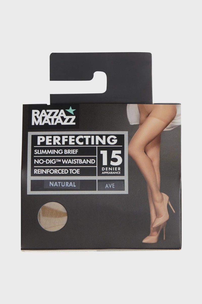 Razzamatazz perfecting sheer slim comes in all shapes and sizes (including a new plus size). The 15 denier sheer is designed to firm up your torso with our slimming brief, offering top notch comfort with a no-dig waistband and reinforced toe. Get comfy and feel fabulous.